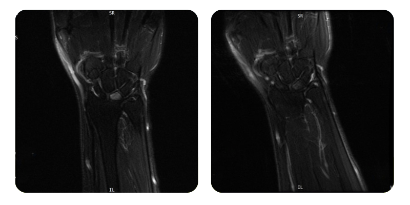 Simptome: Mâna stângă dureri dorsal deasupra semilunei, fără edem.